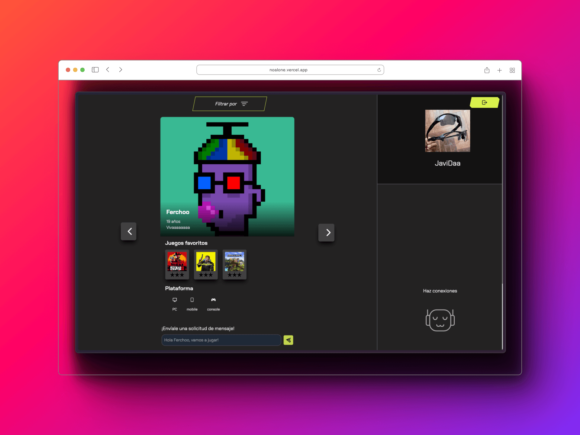 我与一支技术精湛的团队合作开发了一款创新的网络应用程序 NOA,该程序根据游戏玩家的兴趣将他们联系在一起。利用 React、TypeScript 和实时聊天功能,我们为游戏玩家创建了一个寻找最佳队友的平台。我们为自己的成就感到骄傲,也为能提升游戏社区的水平感到兴奋。🚀